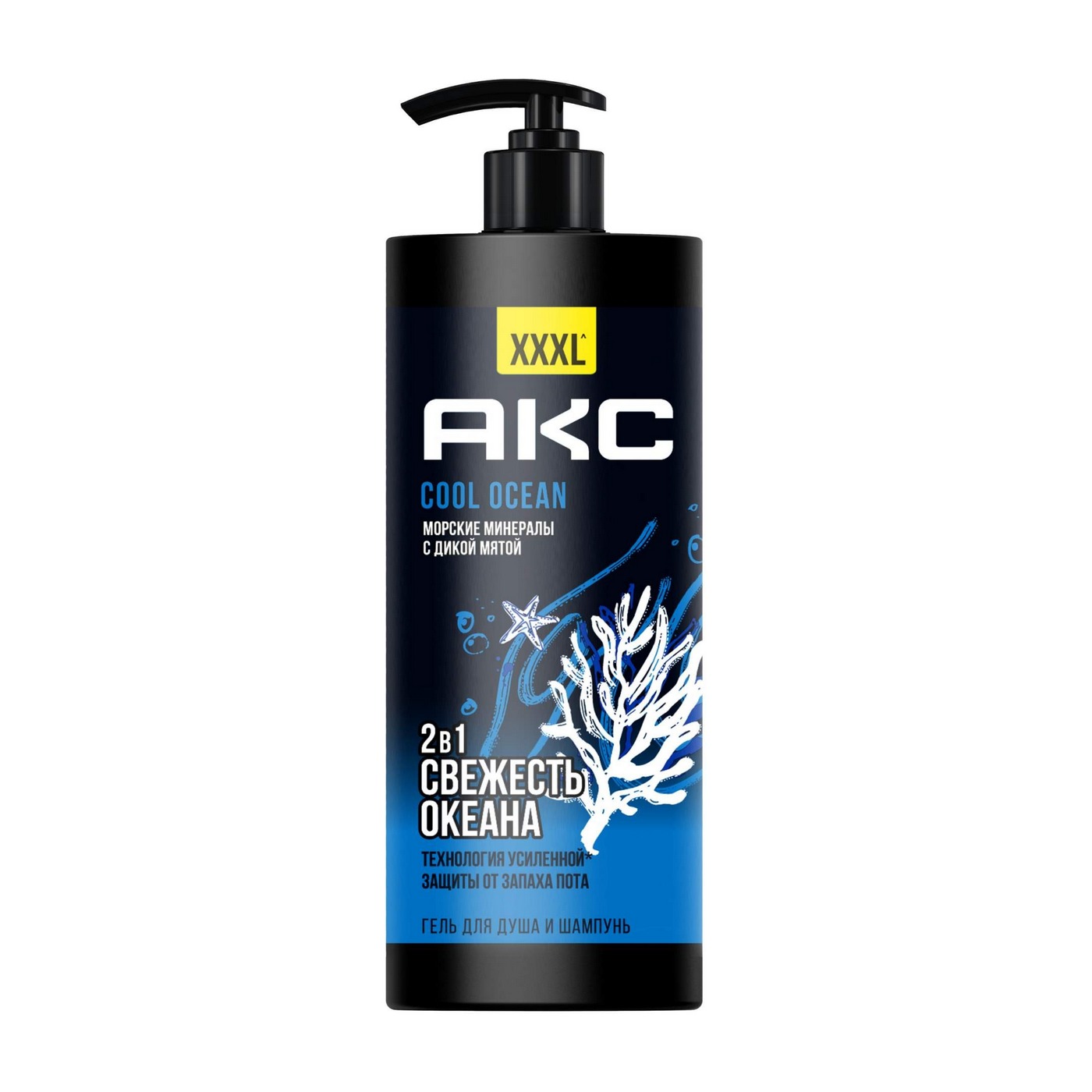 АКС COOL OCEAN - гель для душа и шампунь для волос мужской 2в1 в новом XXXL формате. Средство со 100% топовым ароматом дарит заряд свежести, обеспечивает длительную защиту от запаха пота и заботится о коже и волосах, пока ты находишься в душе. Идеальное попадание для тех, кто привык чувствовать себя на высоте и не согласен на меньшее! Забудь о компромиссах и реализуй свои возможности вместе с гелем для душа парфюмированным АКС COOL OCEAN: Взрывной аромат геля для тела с нотами морских минералов и дикой мяты гармонично раскрывается на коже, оставляет комплиментарный шлейф и дарит сногсшибательное чувство уверенности. Пышная пена геля для душа бережно очищает кожу от запахов и загрязнений, а пребиотики растительного происхождения и увлажняющие компоненты в составе оказывают ухаживающее действие.