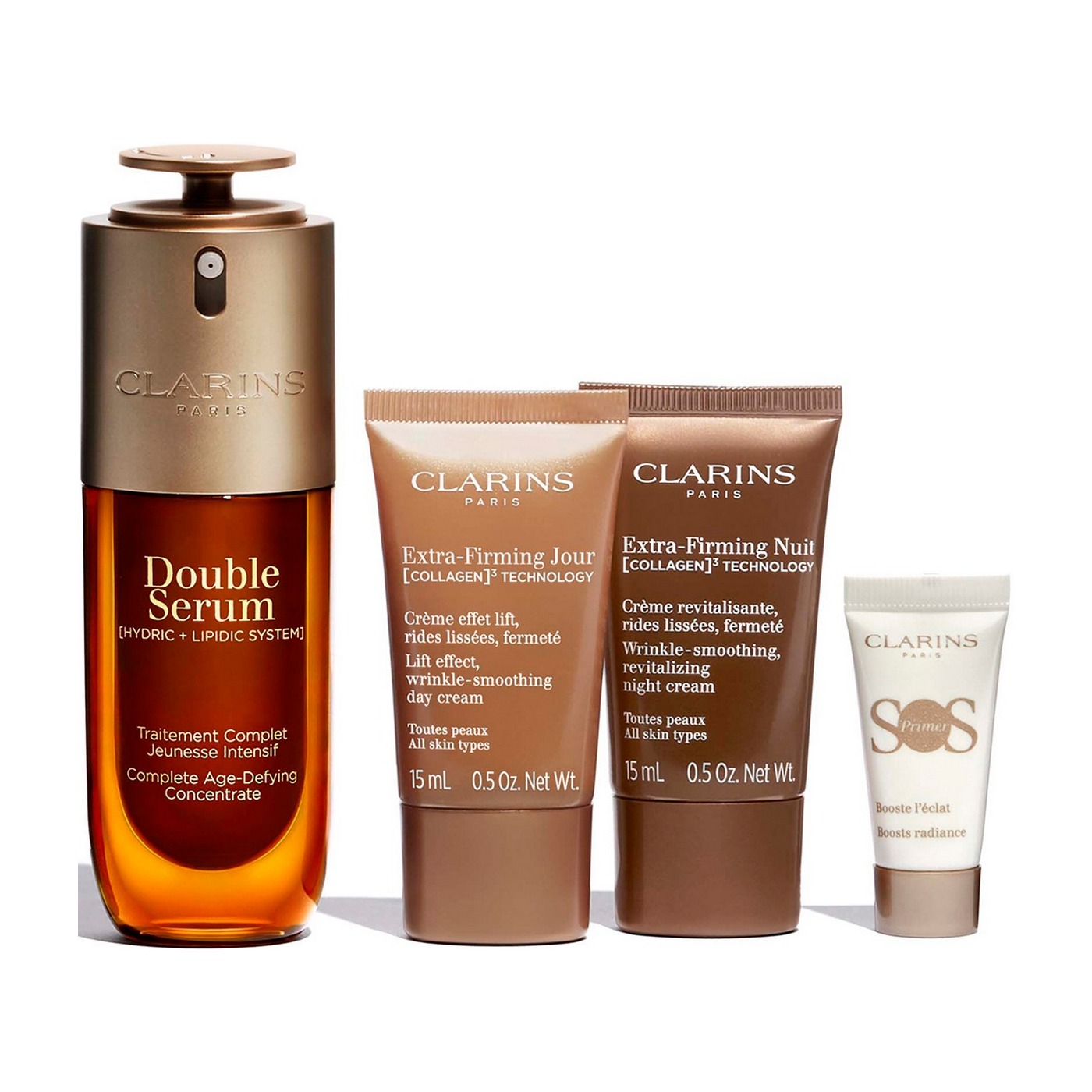 Состав набора: Комплексная омолаживающая двойная сыворотка для лица Double Serum 50 мл; Дневной регенерирующий крем для любого типа кожи [Collagen] 3 Technology Extra-Firming All Skin Types Day Cream 15 мл; Ночной регенерирующий крем для любого типа кожи [Collagen] 3 Technology Extra-Firming All Skin Types Night Cream 15 мл; База под макияж для придания сияния коже SOS Primer White 5 мл. Набор для повышения гладкости, упругости и лифтинга подходит для любого типа кожи. Красивую подарочную коробку можно использовать повторно — например, как органайзер для мелочей. Упаковка пригодна для вторичной переработки. Для производства картона использовалась древесина из устойчиво управляемых лесов. Легендарная двойная сыворотка — комплексный омолаживающий уход нового поколения и важная составляющая любого антивозрастного ухода. В регенерирующих дневном и ночном кремах задействована новая технология [Collagen]?. Содержит полипептид коллагена, экстракт пекана, экстракт митракарпа и способствует значительному