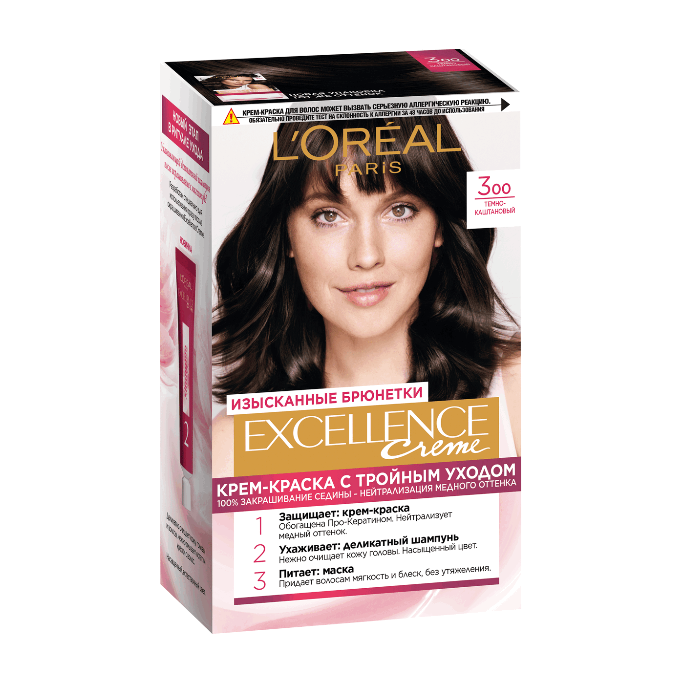 Ритуал тройного ухода: уход за цветом, уход за кожей головы, уход за волосами. Крем-краска с тройным уходом. 100% закрашивание седины. 1. Защищающая крем-краска для волос. Обогащена Про-Кератином и защищающей сывороткой для защиты волос во время окрашивания. 2. Новый этап в ритуале ухода: ухаживающий деликатный шампунь после окрашивания с мягким pH. Деликатно очищает кожу головы и волосы после окрашивания. 3. Легкая питательная маска для волос. Обогащена Керамидом. Питает волосы, делает их мягкими и блестящими, без утяжеления.