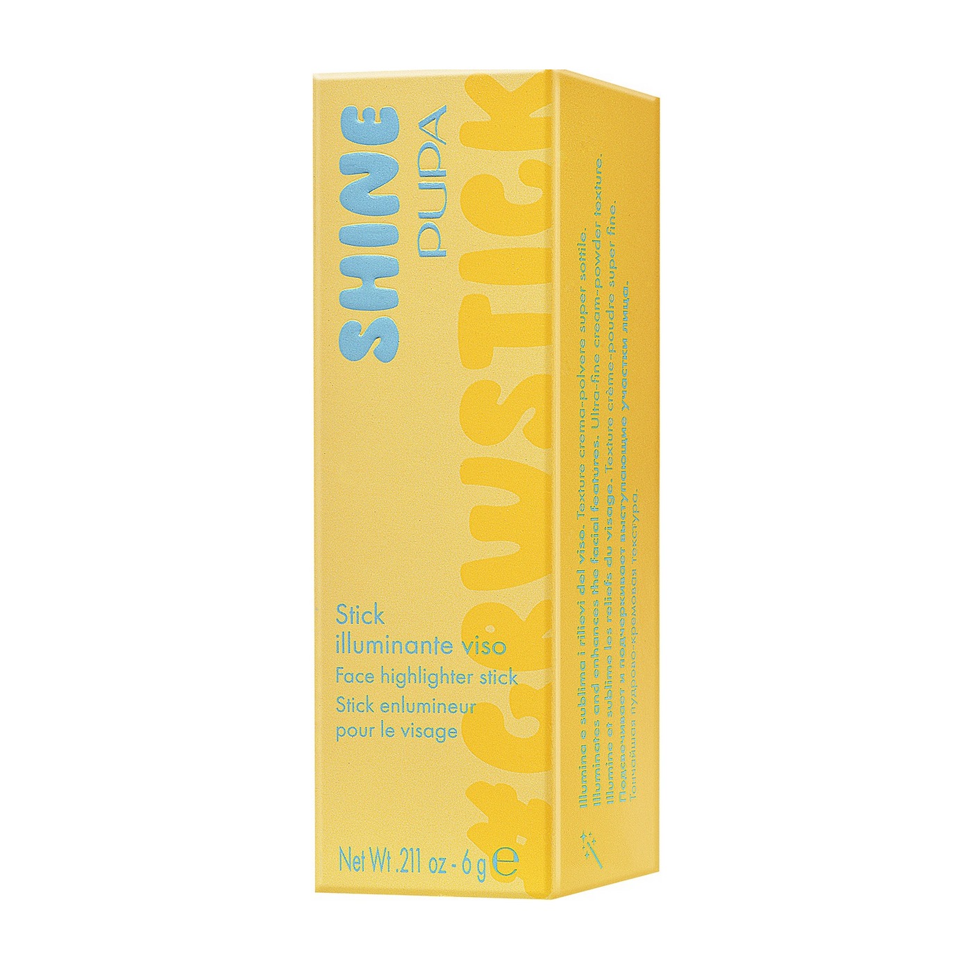 Лимитированная коллекция Pupa #GetReadyWithStick посвящена трендовому на данный момент формату – стику. Универсальный и подходящий для всех, он позволяет создать полноценный образ всего за несколько шагов. Его удобно брать с собой, чтобы быстро и точно обновлять макияж в течение дня – настоящий must-have для сумочки. Хайлайтер Shine с кремово-пудровой текстурой дарит насыщенные тактильные ощущения. Оставляет на коже тонкую вуаль перламутровых частиц, раскрывающихся во всей красоте на свету. Подчеркивает черты лица максимально естественно и без резких границ, создавая эффект «второй кожи». Нежная, маслянисто-шелковистая формула обеспечивает комфортное нанесение и уход за кожей. Обладает эффектом таяния. Подходит для создания акцентов света и выразительного сияющего финиша.